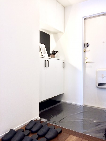 玄関は自宅の顔、玄関は一番明るくしたかったので、白を基調として扉はあえて黒。ものすごくシックな色合いで、落ち着いた雰囲気が気に入ってます。